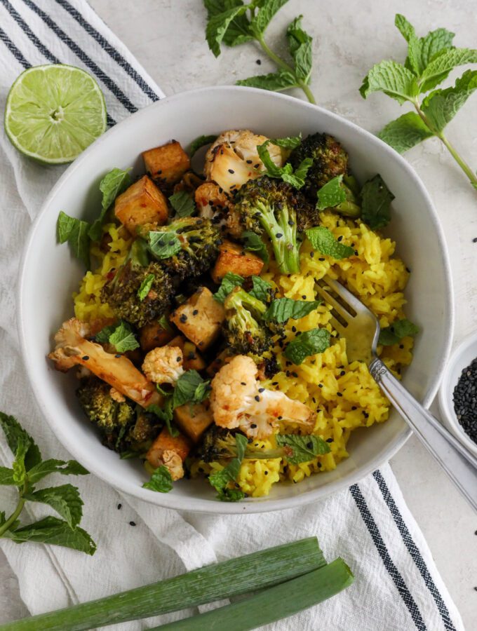Here’s how I mix all of my favorites to create a yummy plant-based bowl that’s packed with protein, seasonal veggies, and holiday garnishes.