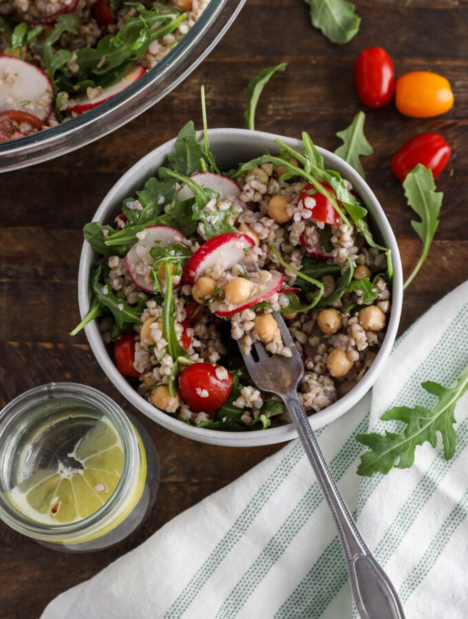 For dressing, I like to go with a simple cold-pressed avocado oil and balsamic vinegar combo or a classic oil-free lemon-tahini.