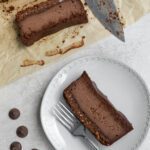 Vegan Chocolate Cheesecake sliced and served on a plate by Flora & Vino
